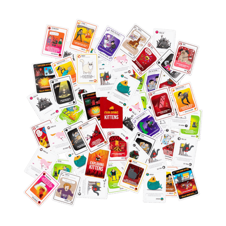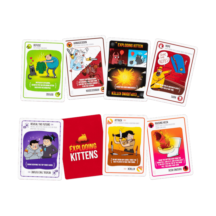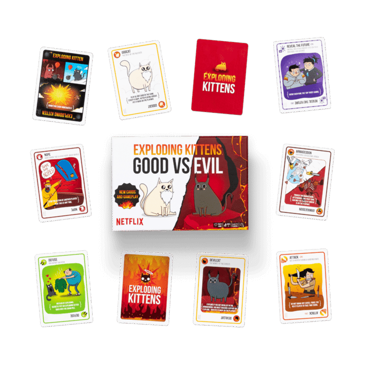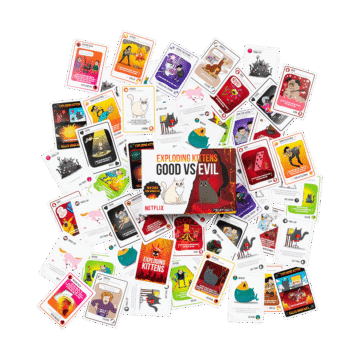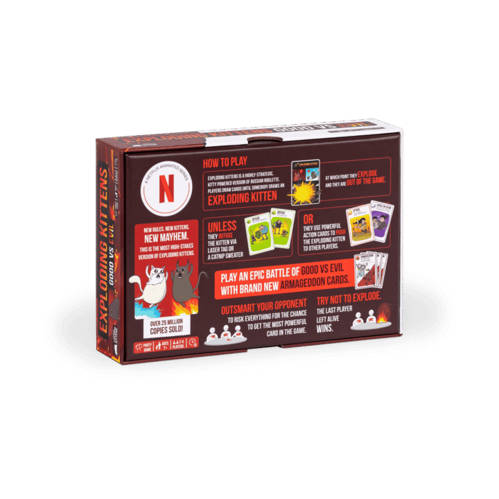 Exploding Kittens: Good vs Evil. Se till att inte explodera. Sist överlevande vinner. Med Armageddon-kort. 2-5 spelare. Från 7 år.