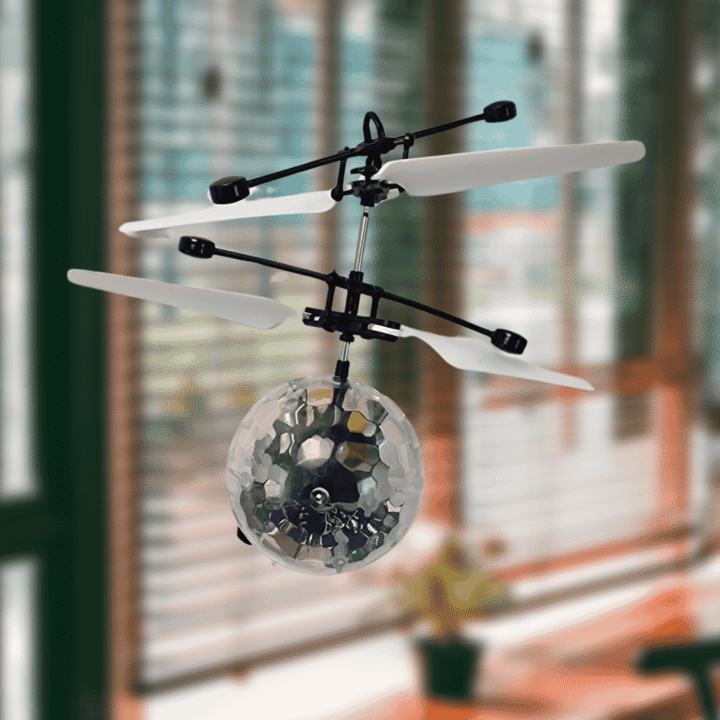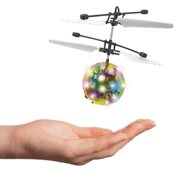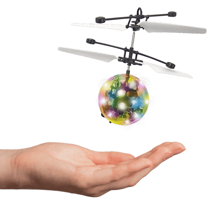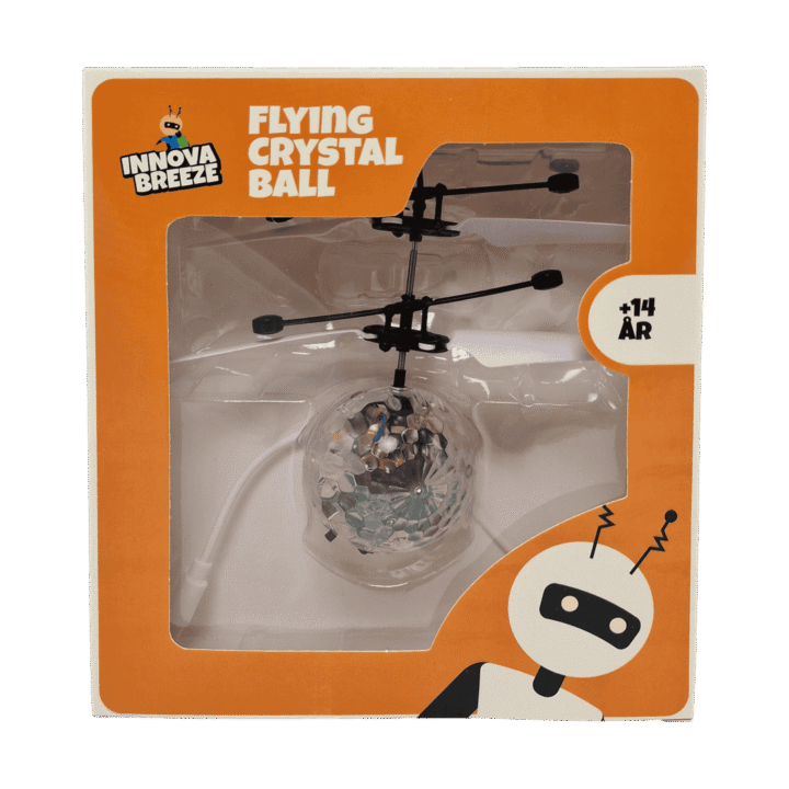 Flygande boll. Med sensor för styrning av höjd, blinkande LED-ljus och USB-laddning. Flygtid 5 min. 12×14 cm. Från 14 år.