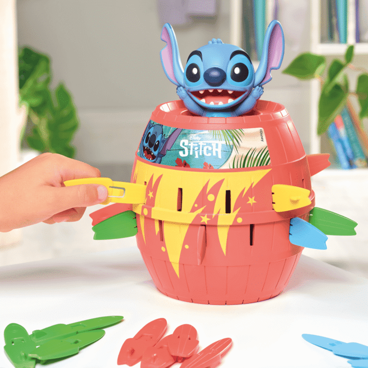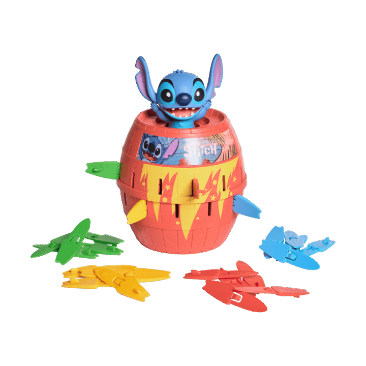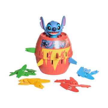 Pop-up Disney Stitch. Sällskapsspel. Kan du sticka din bräda genom tunnan utan att Stitch hoppar upp? 2-4 spelare. Från 4 år.