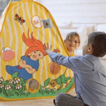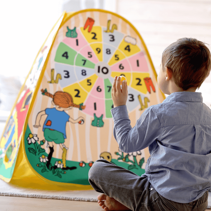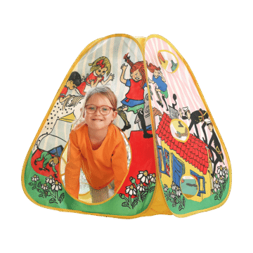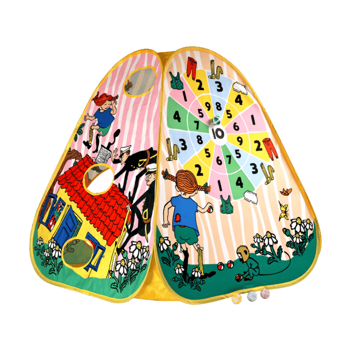 Pippi. Pop up-tält. Med spel – kasta diskar genom hål, bollar på poängtavla och ärtpåsar i nätfickor. Förvaringsväska ingår. Från 3 år.