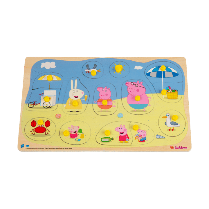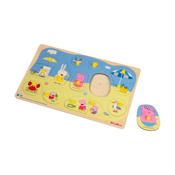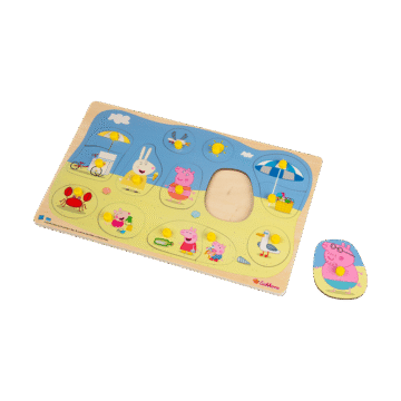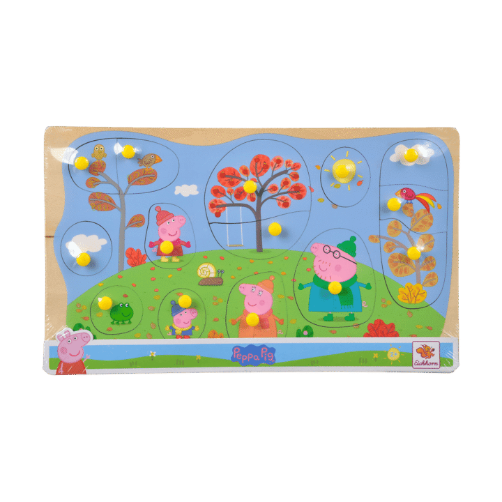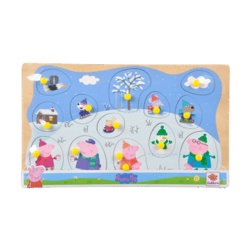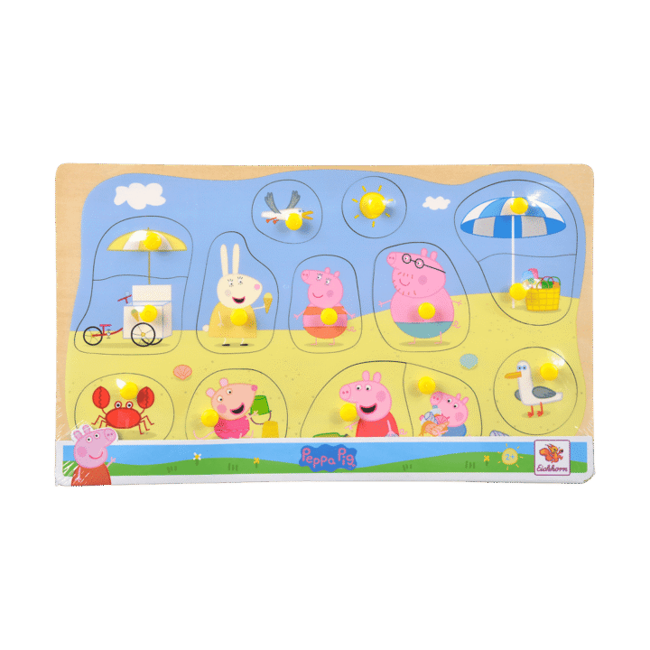 Greta Gris. Knoppussel. I trä. 15 bitar. 30×18 cm. Finns flera olika. Från 2 år.
