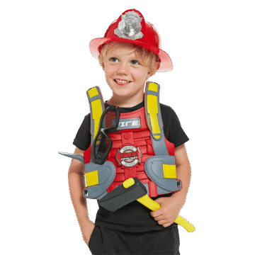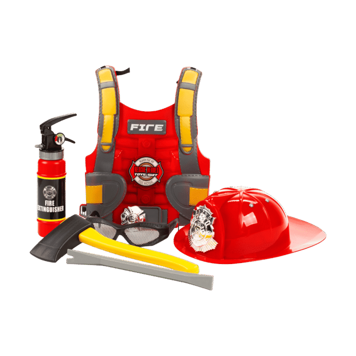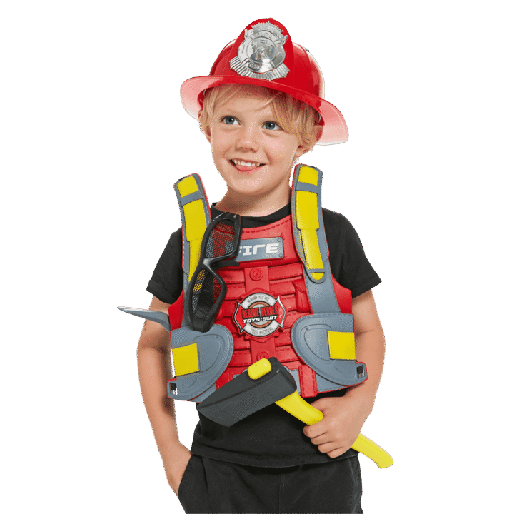 Stort brandmansset. Med hjälm, brandsläckare, skyddsglasögon, kofot, yxa m.m. Från 3 år.