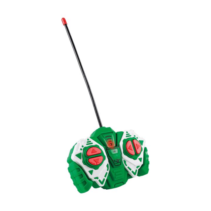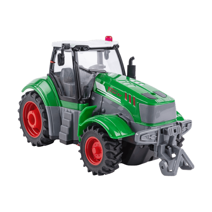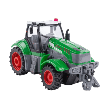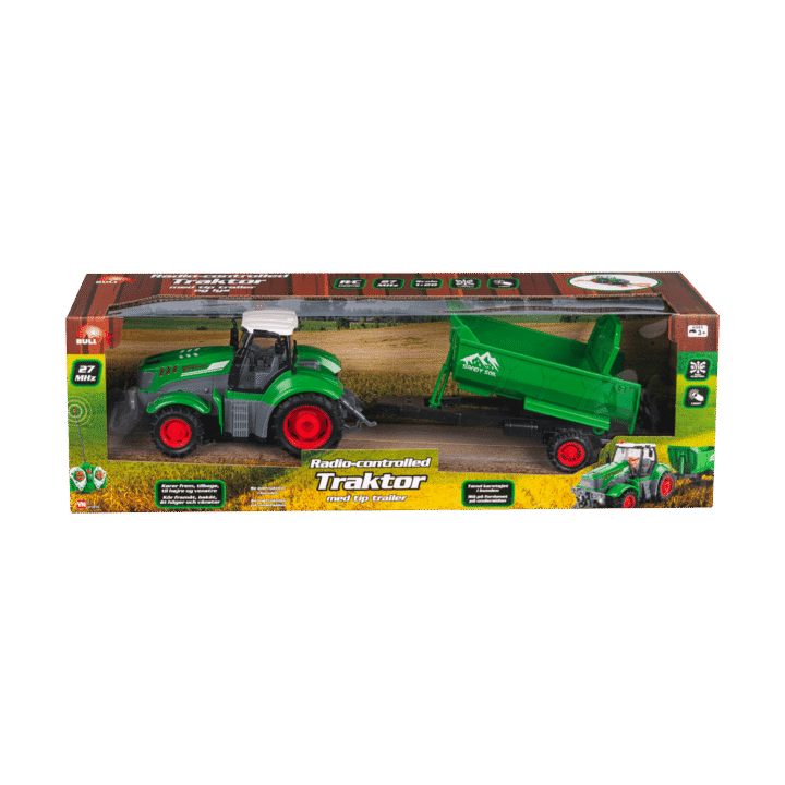 BULL. Radiostyrd traktor. Med tippbart släp, handkontroll 27 MHz och ljus. Skala 1:28. 41 cm. Från 3 år.